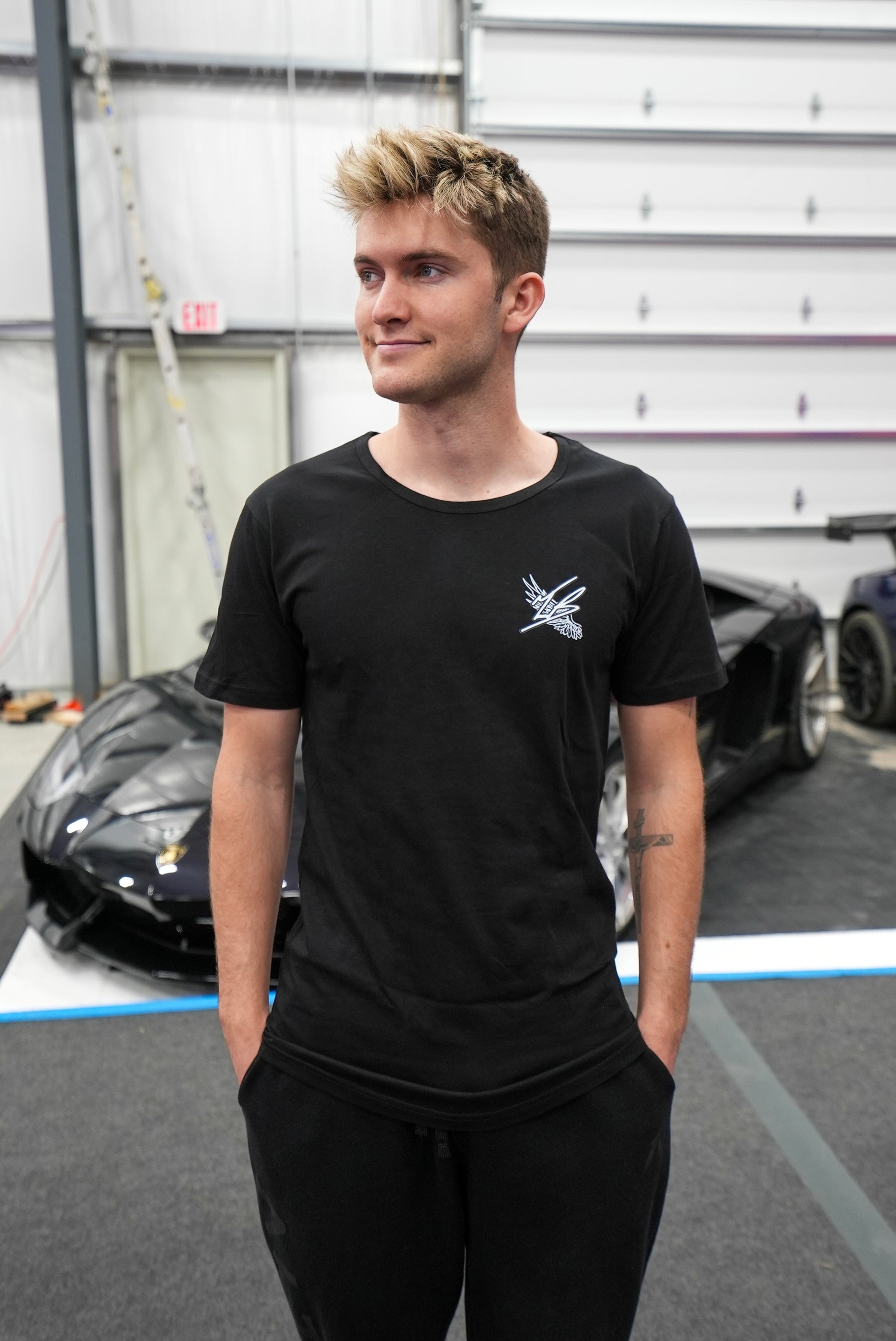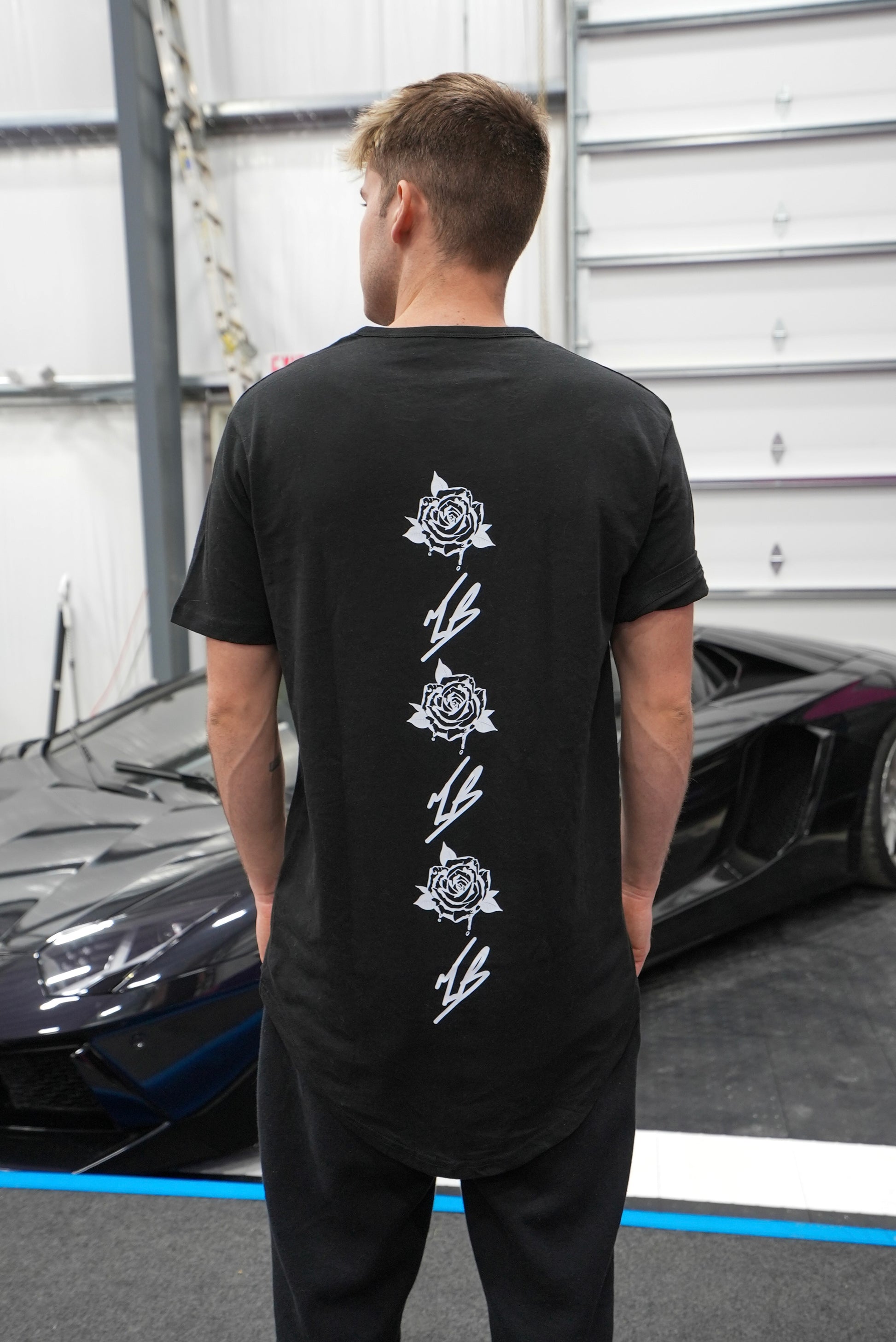Light weight super soft short sleeve black drop tail t-shirt made of 100% ring spun cotton. "TB" signature & Tanner's wing tattoo intersecting on the front, TB & Rose logo alternating down the spine!